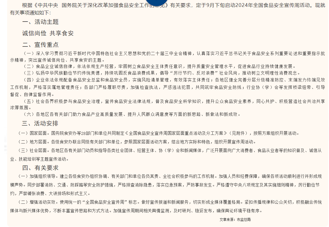 国务院食安办等28部门关于开展 2024年全国食品安全宣传周活动的通知